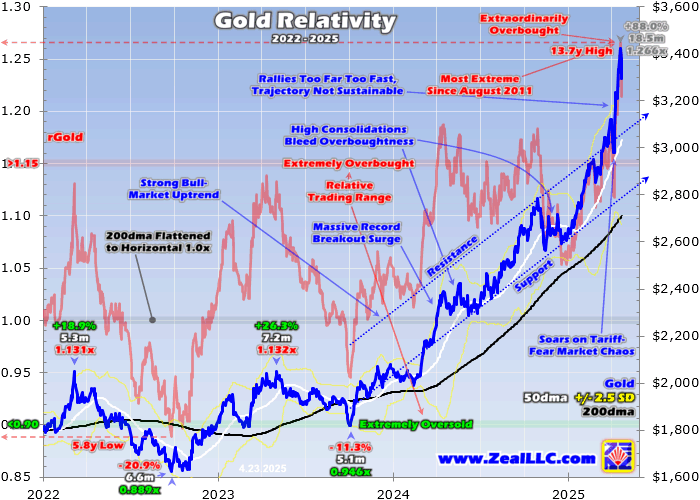 On April 11th, 16th, and 21st which was this Monday, gold blasted up 2.0%, 3.2%, and 3.0% hitting new record closes each day. Those $3,234, $3,334, and $3,421 closes stretched a whopping 20.8%, 23.9%, and 26.6% above gold’s 200dma! That latest 1.266x relative early this week was the most-overbought gold has been in fully 13.7 years! It was also above August 2020’s 1.260x which slayed gold’s last monster upleg.