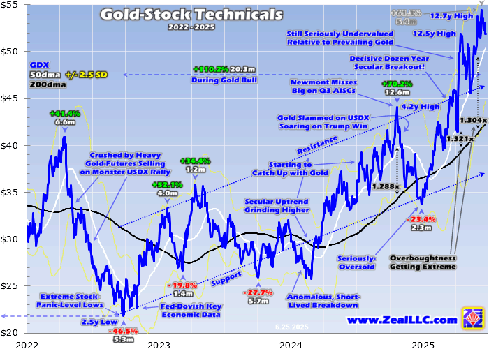 Over the last seven reported quarters starting in Q3’23, the GDX top 25’s implied unit earnings rocketed up 87%, 47%, 31%, 84%, 74%, 78%, and 90% YoY! Q2’25’s probable 74% merely adds on to that truly-extraordinary streak. No other sector in all the stock markets has enjoyed such colossal profits growth. Yet because gold stocks are a small contrarian sector, they’re largely overlooked by the great majority of investors.
