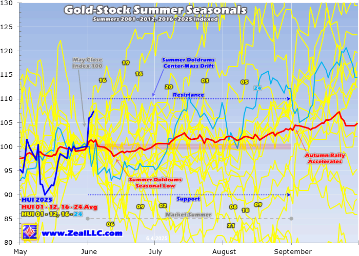Market summers run June, July, and August, or effectively from the Memorial Day long weekend to the Labor Day one. On average during the gold-bull summers of 2001 to 2012 and 2016 to 2024, gold stocks rallied 1.1% on June’s first trading day. This latest Monday’s 106.0 indexed ranks as the second-biggest in this dataset. June’s best first days clocked in at 106.7 indexed in 2012, 105.1 in 2001, and 105.0 in 2019.