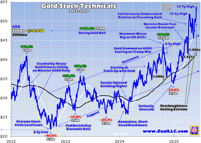 Like usual, gold stocks’ near-term outlook in these young summer doldrums depends on how their metal fares. Since mid-April’s crazy-overbought peak, gold has been drifting in a high consolidation between about $3,175 to $3,425. If gold can manage to hang around in the upper half of that range for the next month or so until its seasonal autumn rally can get underway, gold stocks will likely mostly drift sideways with it.