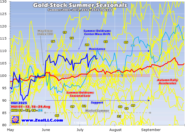 Normally the major gold stocks of the HUI and GDX drift lower to sideways in summers’ first-halves into mid-July. But this year miners surged sharply out of the summer gates as June dawned, and have held those gains since. Summer-to-date in these modern gold-bull years of 2001 to 2012 and 2016 to 2024, the HUI has averaged just 100.3 indexed. But so far in this summer of 2025 that average has soared to 106.2!