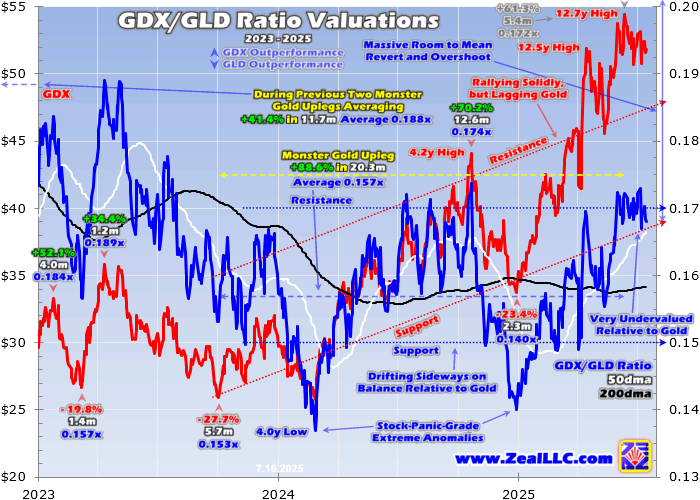 GDX’s 110.2% gains at best so far in gold’s mighty cyclical bull sound good, and are evident in its strong 2025 surge. My first essay published this year as January dawned explained why 2025 would finally be gold stocks’ revaluation year. That thesis has certainly proven right through this year’s first-half, but gold stocks have lots of rallying left to go. Relative to gold, their advance effectively stalled out exactly a year ago.