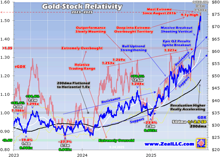 Even if a 25%ish GDX plunge is imminent, the longer-term bullish case for gold stocks remains fantastic. In mid-August, I wrote an essay analyzing the top-25 GDX gold miners’ latest Q2’25 results. They were epic, shattering all records. Over the last eight reported quarters ending in Q2, the GDX top 25’s average implied unit earnings have skyrocketed 87%, 47%, 31%, 75%, 74%, 78%, 90%, and 78% year-over-year!