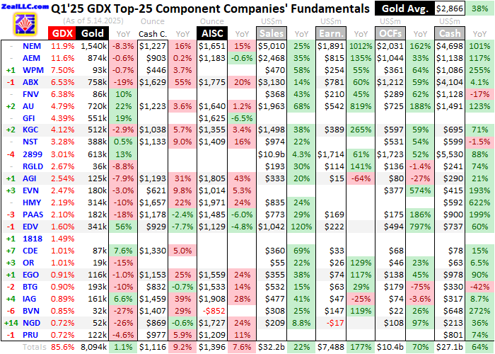 This table summarizes the operational and financial highlights from the GDX top 25 during Q1’25. These gold miners’ stock symbols aren’t all US listings, and are preceded by their rankings changes within GDX over this past year. The shuffling in their ETF weightings reflects shifting market caps, which reveal both outperformers and underperformers since Q1’24. Those symbols are followed by their current GDX weightings.