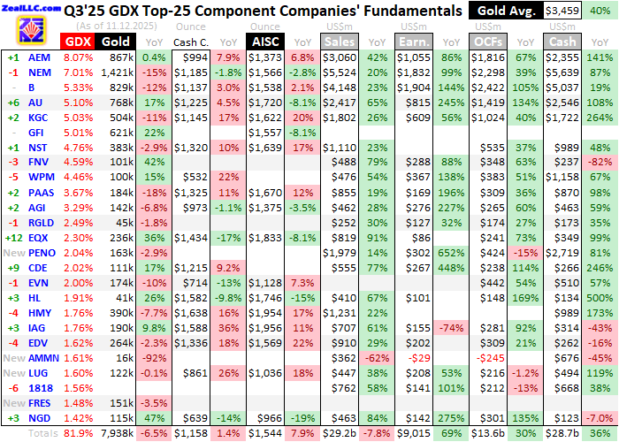 This table summarizes the operational and financial highlights from the GDX top 25 during Q3’25. These gold miners’ stock symbols aren’t all US listings, and are preceded by their rankings changes within GDX over this past year. The shuffling in their ETF weightings reflects shifting market caps, which reveal both outperformers and underperformers since Q3’24. Those symbols are followed by their current GDX weightings.
