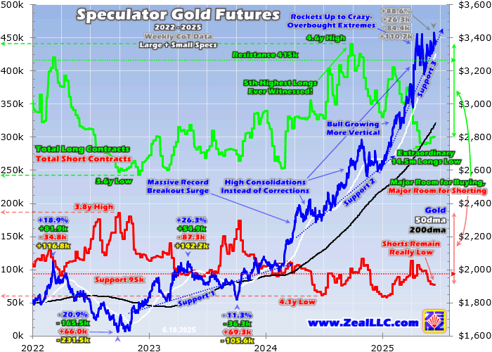 Specs’ lack of long dumping has to be the dominant reason gold has consolidated high recently instead of selling off hard. And such low spec longs are also quite bullish for the yellow metal. They slumped to a 14.5-month low in mid-May, levels last seen in late February 2024 when gold was still down at $2,030! All the spec long buying since has effectively been reset, leaving these guys big capital firepower to resume buying.