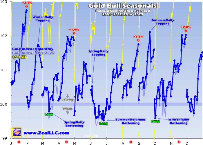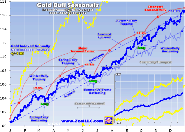 Then all those individual-bull-year indexes are averaged together. The dark-blue line includes all 22 bull years in this past quarter-century, with 2025’s astounding 64.3% gold gains now averaged in. The light-blue line shows last year’s seasonals before 2025 was added, revealing the resulting massive change. Last year’s huge gold rally proved super-outsized, with big Chinese buying playing a leading role in those gains.