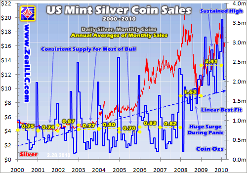 Since early 2008, the US Mint has steadily ramped its monthly silver Eagle production. After averaging just 0.70m to 0.87m ounces of monthly production annually between 2000 and 2007, in 2008 this shot up to 1.63m and in 2009 it surged again to 2.41m. Total silver Eagle production soared 46.9% in 2009 to 28.8m silver Eagle coins! Back in 2000 for comparison, only 9.1m were produced.