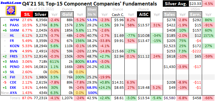 This table summarizes the operational and financial highlights from the SIL top 15 during Q4’21. These major silver miners’ stock symbols aren’t all US listings, and are preceded by their rankings changes within SIL over this past year. The shuffling in their ETF weightings reflects shifting market caps, which reveal both outperformers and underperformers since Q4’20. Those symbols are followed by current SIL weightings.