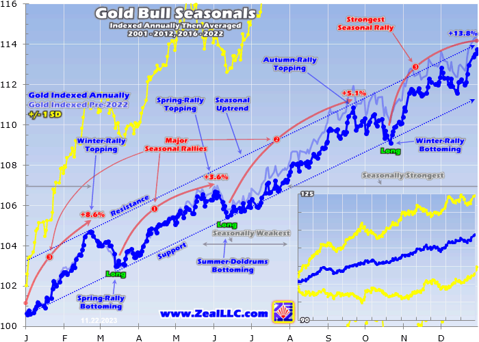 The usual frenzied Western jewelry buying heading into Christmas shifts to pure investment demand after year-end. That’s when Western investors figure out how much surplus income they earned during the prior year after bonuses and taxes. Some of this is plowed into gold in January, driving it higher. Finally gold’s big winter rally climaxes in late February on major Chinese New Year gold buying flaring up in Asia.