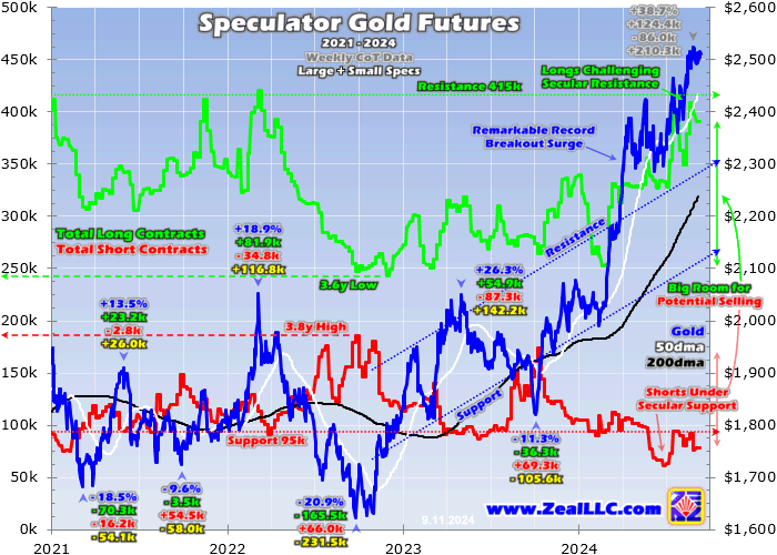 Spec longs are way more important for gold’s fortunes. Since this gold upleg was born, on average spec longs have outnumbered shorts by a whopping 3.3x! So longs have proportionally-more influence on gold’s short-term price action. Back in early October when gold bottomed, total spec longs were really low at just 264.8k contracts. But since then they soared as high as 408.5k in late August, challenging resistance.