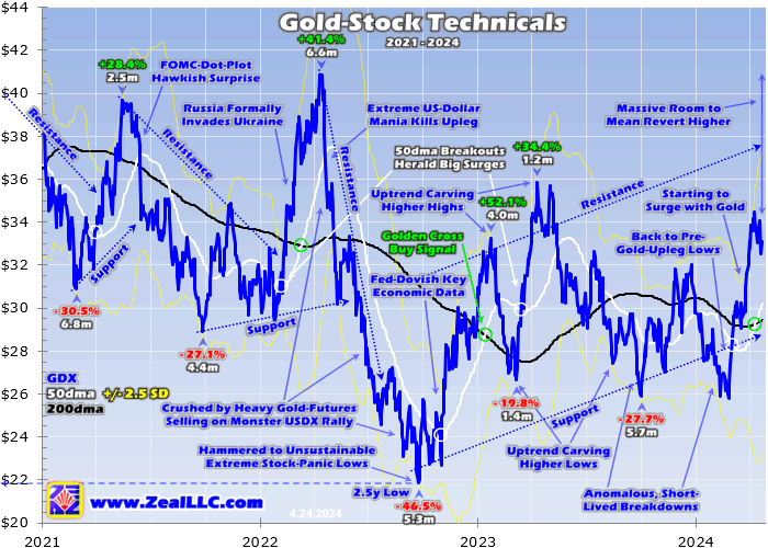 Despite the gold miners’ phenomenal fundamentals, midweek GDX was merely drifting near $33. The major gold stocks were trading at similar levels over three years ago in March 2021, when gold was only averaging near $1,725. At this span’s highwater mark in mid-April 2022, GDX was challenging $41 while gold was around $1,975. So with gold running over $2,300 today, gold stocks should be a heck of a lot higher.