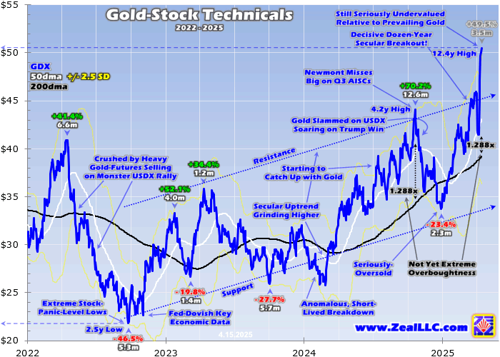 The GDX major-gold-miners ETF skyrocketed 19.8% in three trading days ending last Friday! That catapulted GDX to a $49.70 close, a dazzling 12.4-year secular high. The gold stocks continued rallying this week, with GDX hitting $50.50 Tuesday and running $52.50 Wednesday morning as I pen this essay. These are the best levels the major gold stocks have seen since November 2012, pretty much an eternity ago.