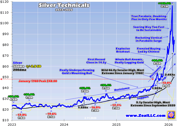 From late October to late January, silver skyrocketed a jaw-dropping 149.0% in just 3.1 months! That astounding run included 23 new all-time-record closes, achieved on nearly 3/8ths of its trading days. My quarter-century-plus of historical market studies have led me to define parabolas as doublings within two-to-three months following massive bull runs. Silver certainly fit that bill by mid-January, its extremes were crazy.